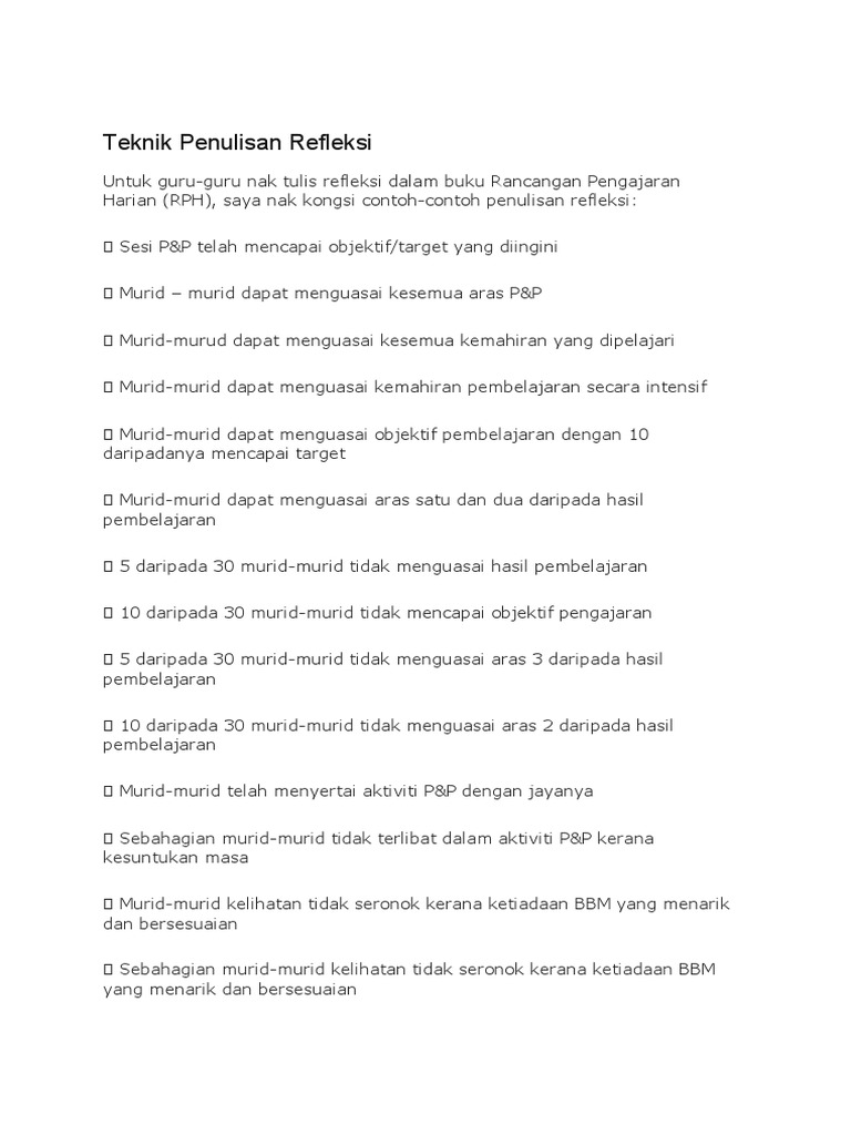 Murid-murud dapat menguasai kesemua kemahiran yang dipelajari. Cara penulisan refleksi yang mudah tepat ringkas untuk rph guru guru buku tulisan. Kotakkertassuratkhabarbotol plastikkaca dan lain-lain.